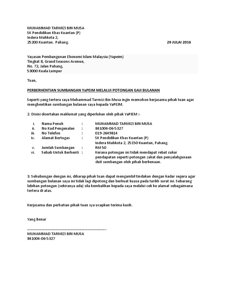 Contoh Surat Berhenti Potongan Yapeim Rentetan isu skandal yapeim oleh jamil khir ramai meminta kami kongsikan format atau cara berhentikan sumbangan kepada yapiem. Contoh Waqaf Waqfu Aula terdapat dalam surat Al-Maaida. Contoh surat kuasa pemotongan gaji kop surat perusahaaninstansi.